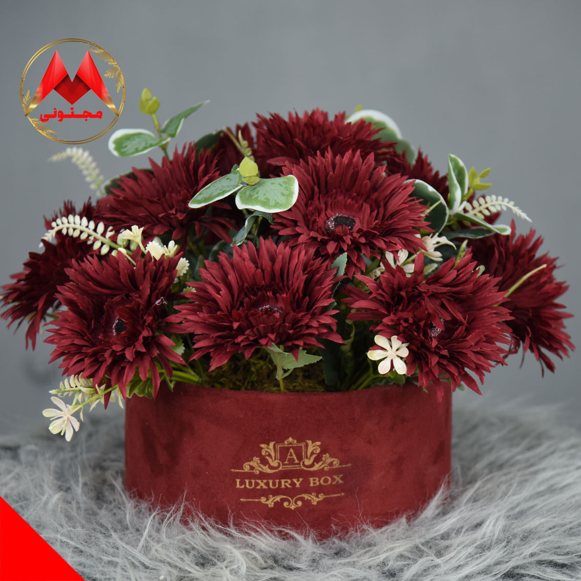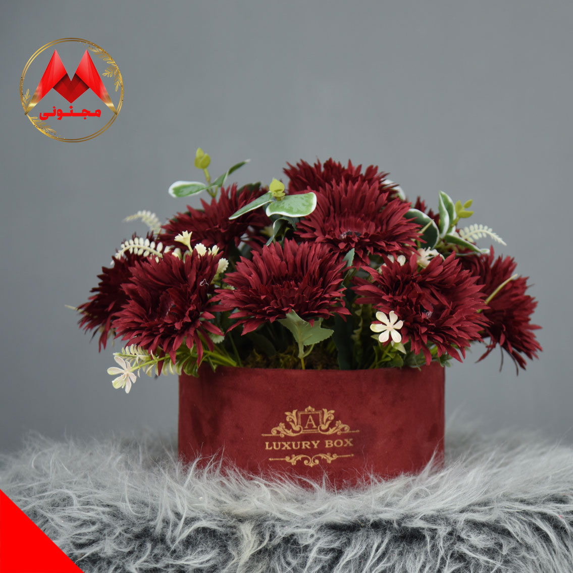 باکس گل داودی زرشکی مجنونی – انتخابی ماندگار برای هدیه‌های خاص